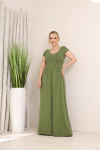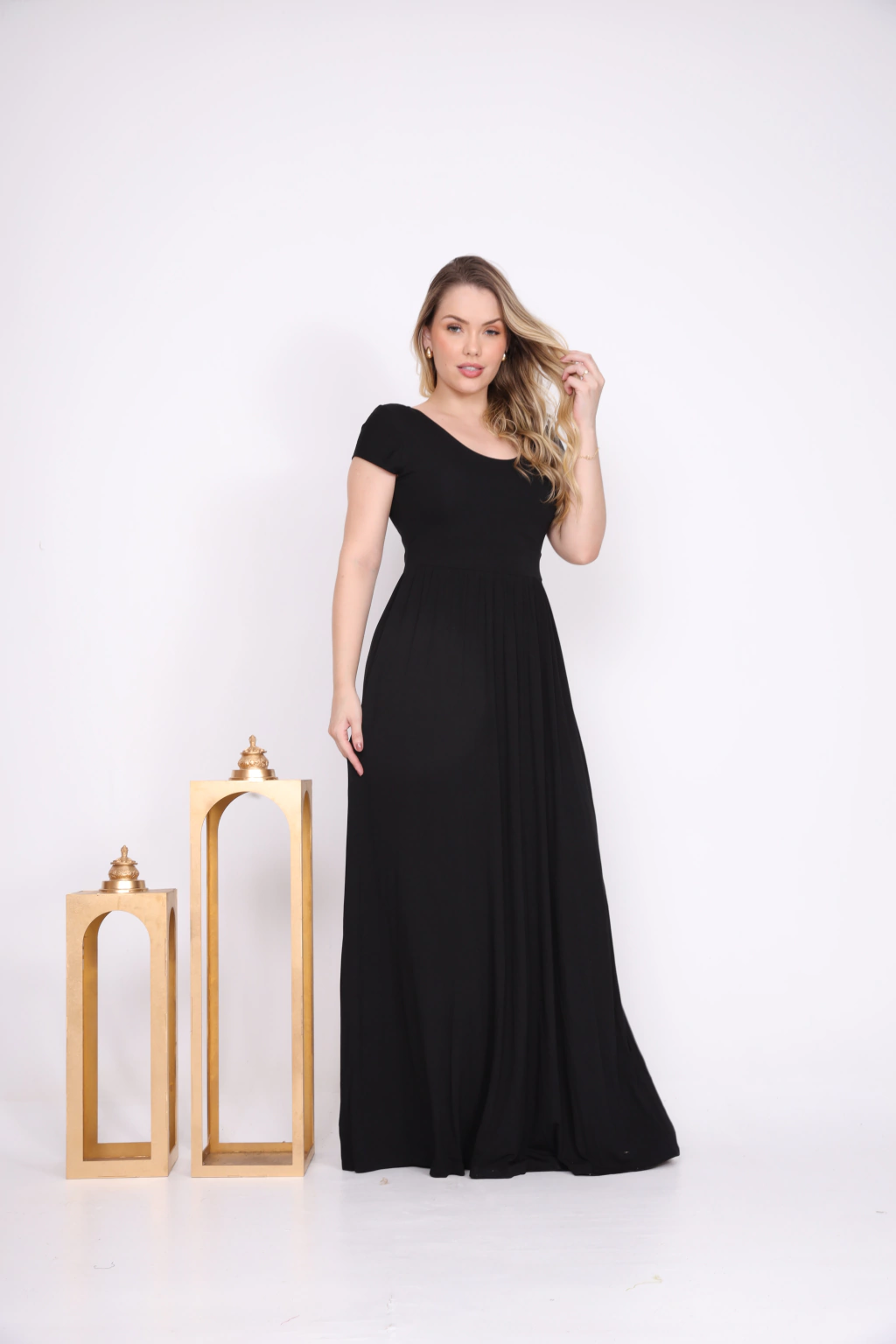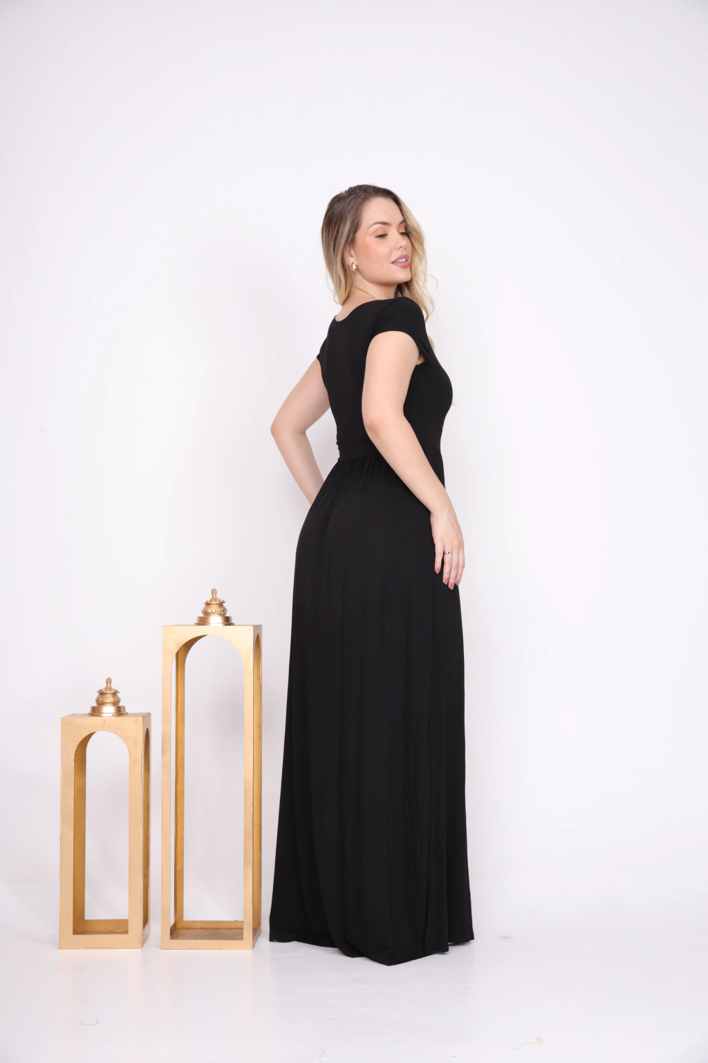 vestido longo com uma tala no meio para disfarçar a barriga, dando um aspecto mais chique como podem ver na foto